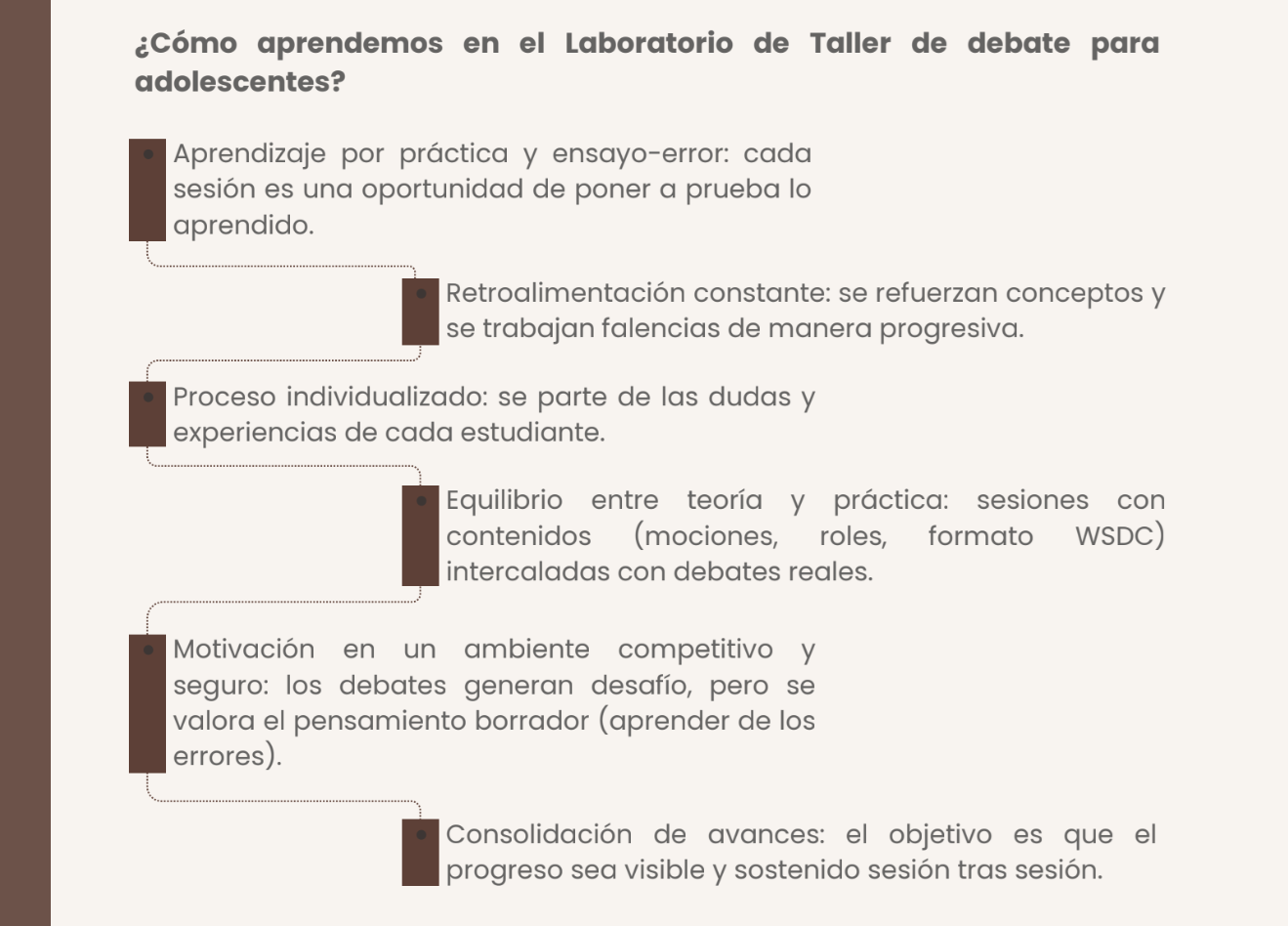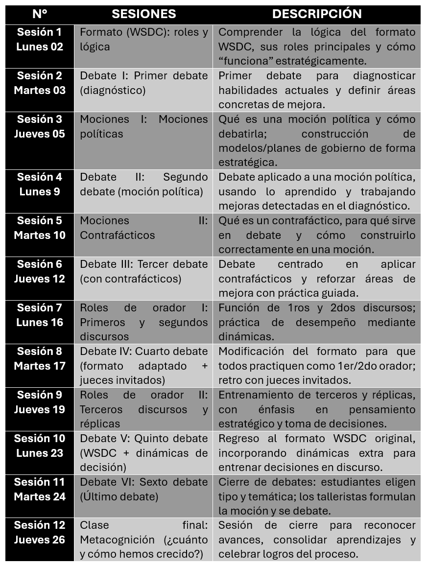 Esta nueva edición del taller de Iniciación al Debate Competitivo es una propuesta de aprendizaje dinámico basada en la práctica del formato WSDC (World Schools Debating Championship), el modelo de debate más reconocido a nivel escolar en el mundo. A través de sesiones que combinan teoría y práctica, los estudiantes no solo dominarán la estructura del formato —discursos de 8 minutos, réplicas, puntos de información y equipos de tres oradores—, sino que también desarrollarán habilidades clave de comunicación, pensamiento crítico y trabajo en equipo. Además, explorarán las discusiones más relevantes y clásicas del debate competitivo, fortaleciendo su capacidad para argumentar con solidez, refutar con confianza y expresarse con claridad en contextos académicos y personales. El taller está dirigido a estudiantes de 1ero a 5to de secundaria.